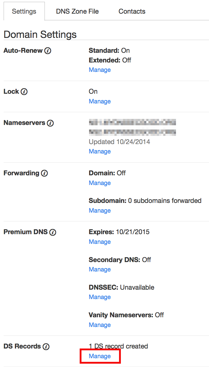 1. Scroll down to the "DS Records" section and click Manage.